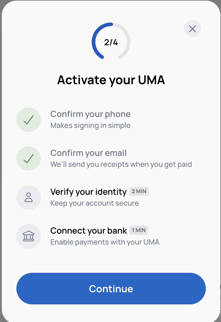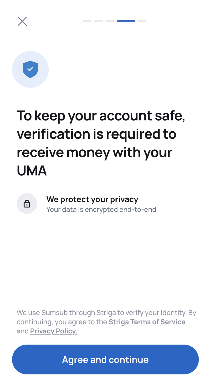 Befolgen Sie diese Schritte, um Ihr UMA-Konto einzurichten, Ihre Identität zu verifizieren und Ihr Bankkonto zu verknüpfen, damit Sie Geld senden und empfangen können.